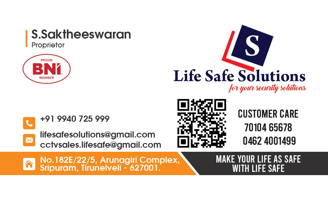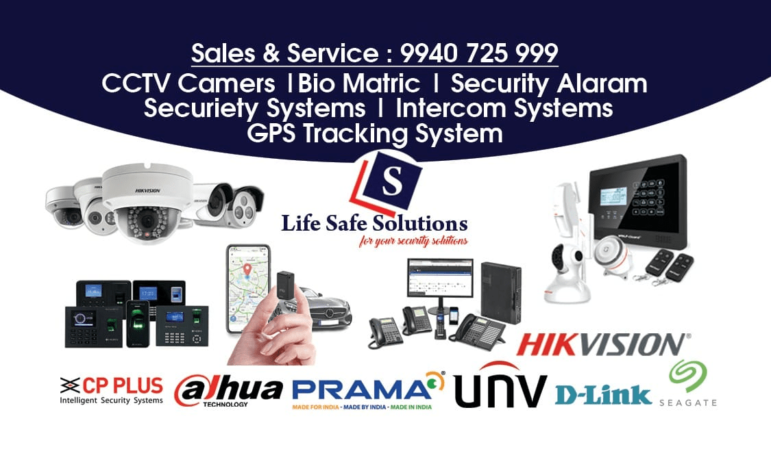 Life Safe Solution is a Tirunelveli-based security systems provider offering CCTV, biometric access, video door phones, and GPS vehicle tracking solutions. We deliver professional installation, maintenance, and support for all leading brands, ensuring reliable protection and peace of mind for homes, offices, and businesses. With a strong focus on quality, trust, and customer satisfaction, our team provides end-to-end security solutions tailored to your specific needs. From advanced surveillance to smart access systems, we help you stay secure, connected, and in control at all times.